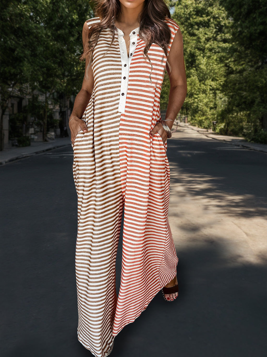 Striped Half Button Cap Sleeve Jumpsuit